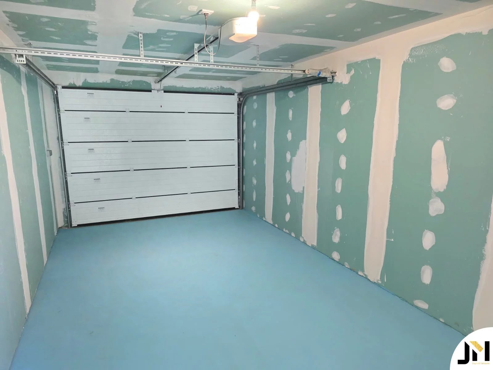 Extra : un garage avec porte motorisée, une place de stationnement devant le garage, un jardin offrant une vue dégagée sur l’arrière.