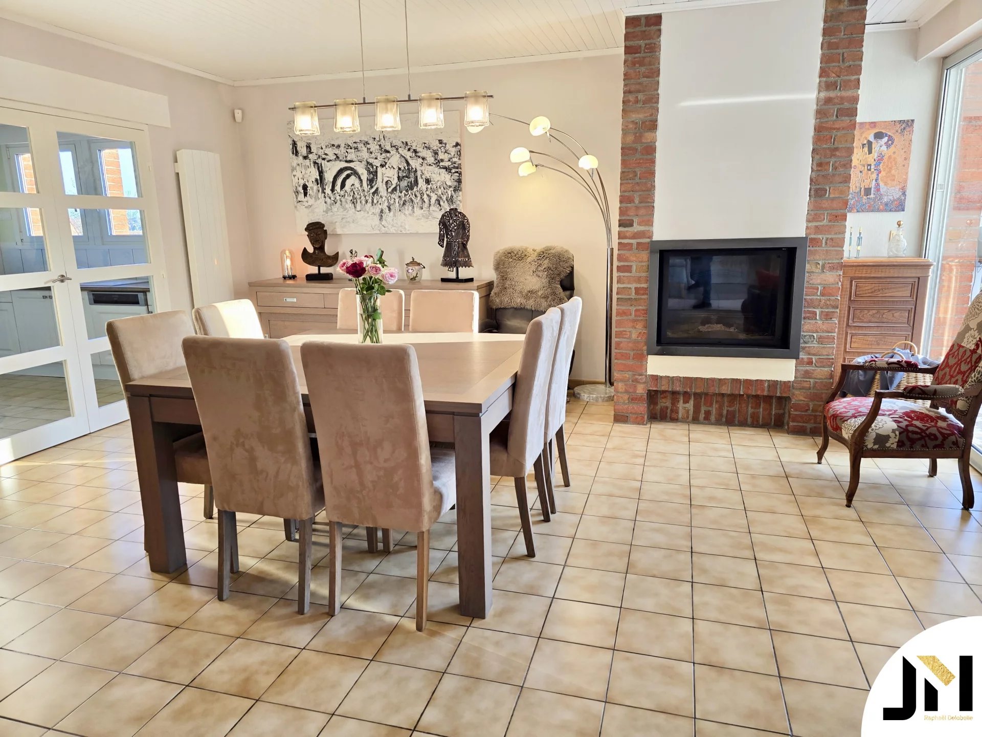La maison s’ouvre ensuite sur un magnifique salon-séjour d'environ 50m2 baigné de lumière, sublimé par une cheminée à feu de bois avec insert René Brisach, véritable élément central de la pièce.
